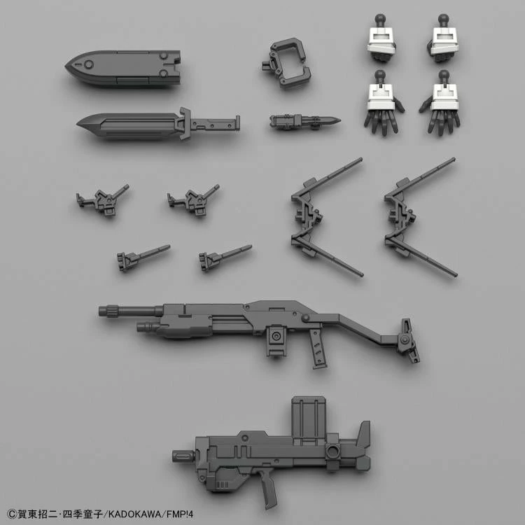 Arbalest employs military themed armaments such as the “Boxer” 57mm Scattershot rifle, GRAW-2 Monomolecular cutter combat knife that can be mounted on the face, and a new modular customizable weapon platform designed by Ebikawa exclusively for the model kit versino, the Graz Mannlicher AWS2000. Arbalest’s AWS unit features a LDW (Light Defense Weapon) load out. Arbalest’s special Lambda Driver activation is recreated through the use of part swapping, and can be displayed with the sold separately Figure-Rise Effect Aura.