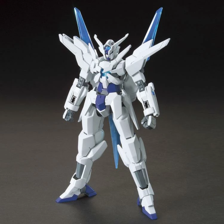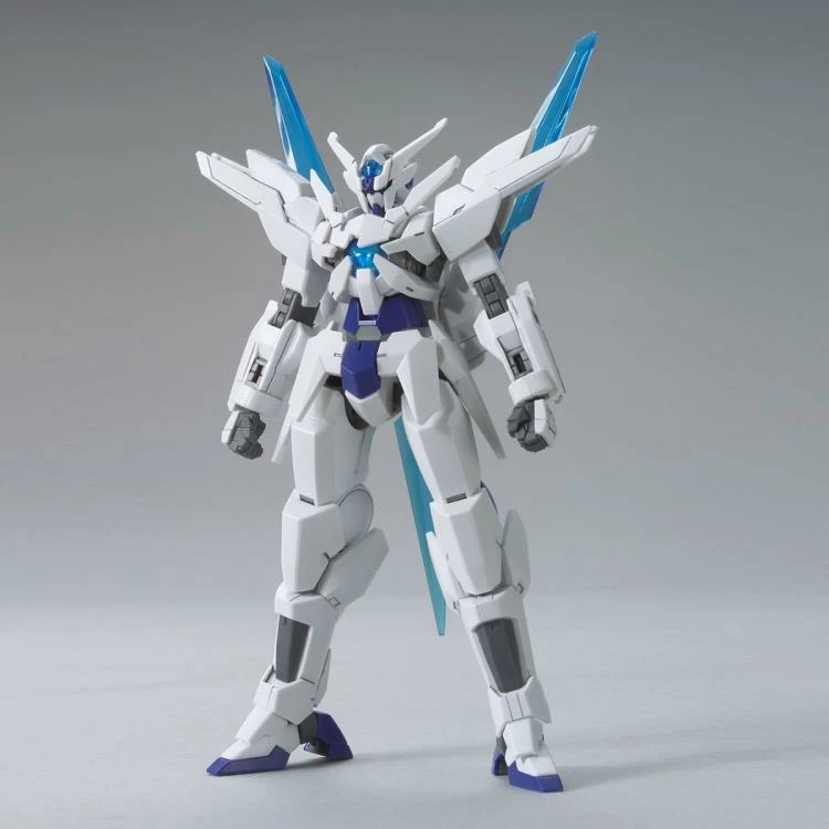 Based on Gundam Build Fighters Try, this model kit of Transient Gundam is in 1/144 scale and becomes a fully articulated figure once complete. The model kit includes two giant lances and features a white an blue color scheme.