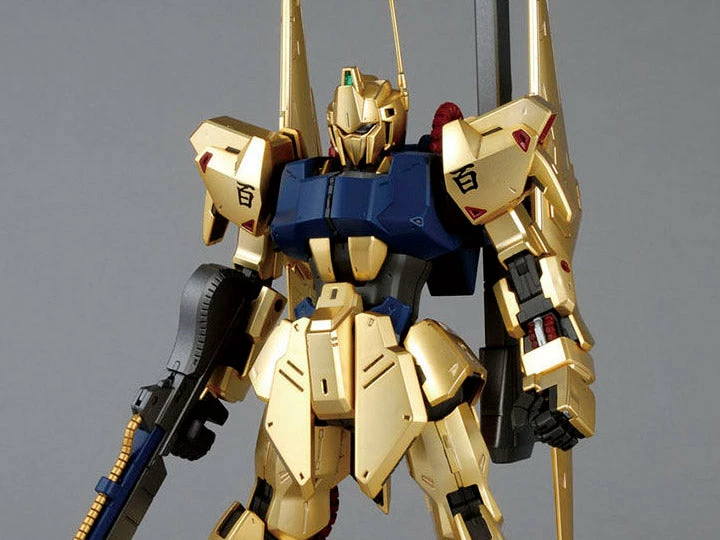 Created to celebrate the 30th anniversary of the Zeta Gundam TV series and complete the Gundam Team trio of the Zeta Gundam and Gundam MK II, the Hyaku-Shiki re-appears in the MG line! Featuring a slimmer profile with stylish new proportion, it contains under-gated parts to reduce appearance of visible cut marks and a special finish over the plastic to replicate its fantastic gold appearance! The vestigial transformation in the legs and wings has been included to provide accuracy to its involvement in the abandoned transformable Delta Gundam project. Different sensor parts in the eyes are included to replicate neutral, activation, and scanning sensor appearance.