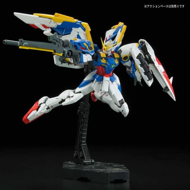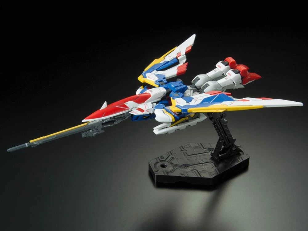 The Wing Gundam as seen in Gundam Wing Endless Waltz by Hajime Katoki and featured prominently in the Glory of Losers manga. The model kit features a Buster rifle with additional ammo cartridges, shield, beam saber, and pop up machine cannons in chest. Can transform into bird mode through rotating parts of the body.