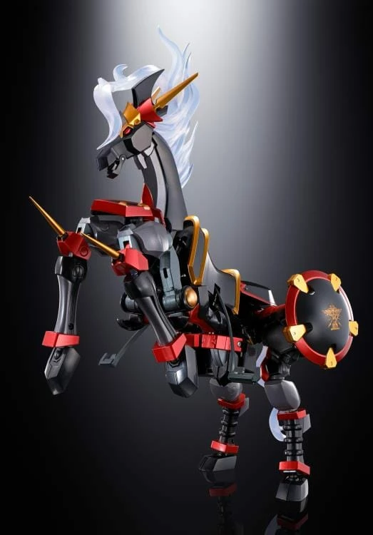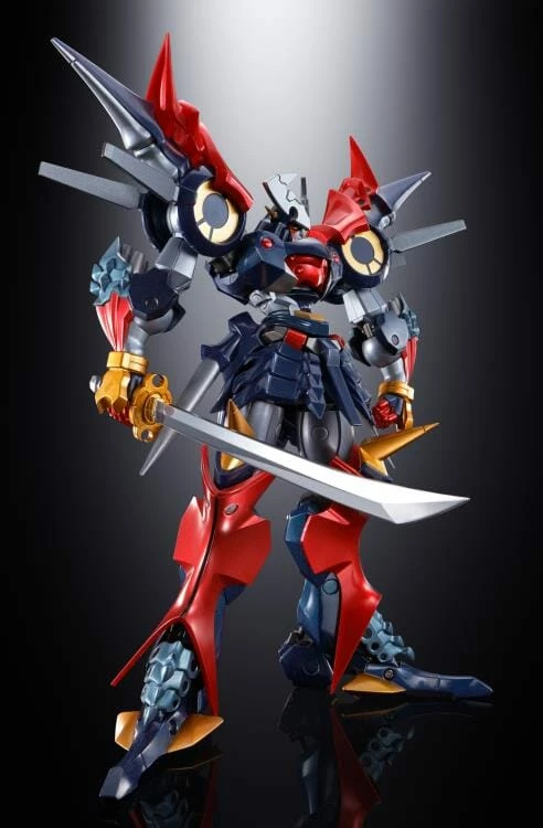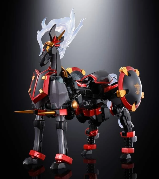 This is a renewed edition of the Soul of Chogokin GX-46 Dygenguar & Aussenseiter set! The incredible transformation is just how you remember it, but the head is newly sculpted and cape is now cloth, which in concert with improved posability and new accessories makes this a seriously powered-up set for fans!