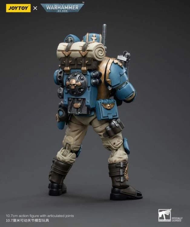 This is a 1/18 scale highly detailed, articulated figure based on Warhammer 40k’s Plasma Gunner of the Astra Militarum Tempestus 55th Kappic Eagles. The Plasma Gunner figure stands about 4.20 inches tall and comes with several interchangeable parts and accessories, opening the door to a plethora of different and unique display opportunities.