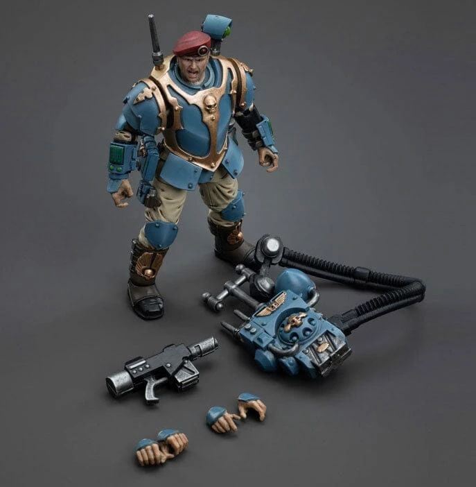 This is a 1/18 scale highly detailed, articulated figure based on Warhammer 40k’s Tempestus Scion of the Astra Militarum Tempestus 55th Kappic Eagles. The Tempestus Scion figure stands about 4.20 inches tall and comes with several interchangeable parts and accessories, opening the door to a plethora of different and unique display opportunities.