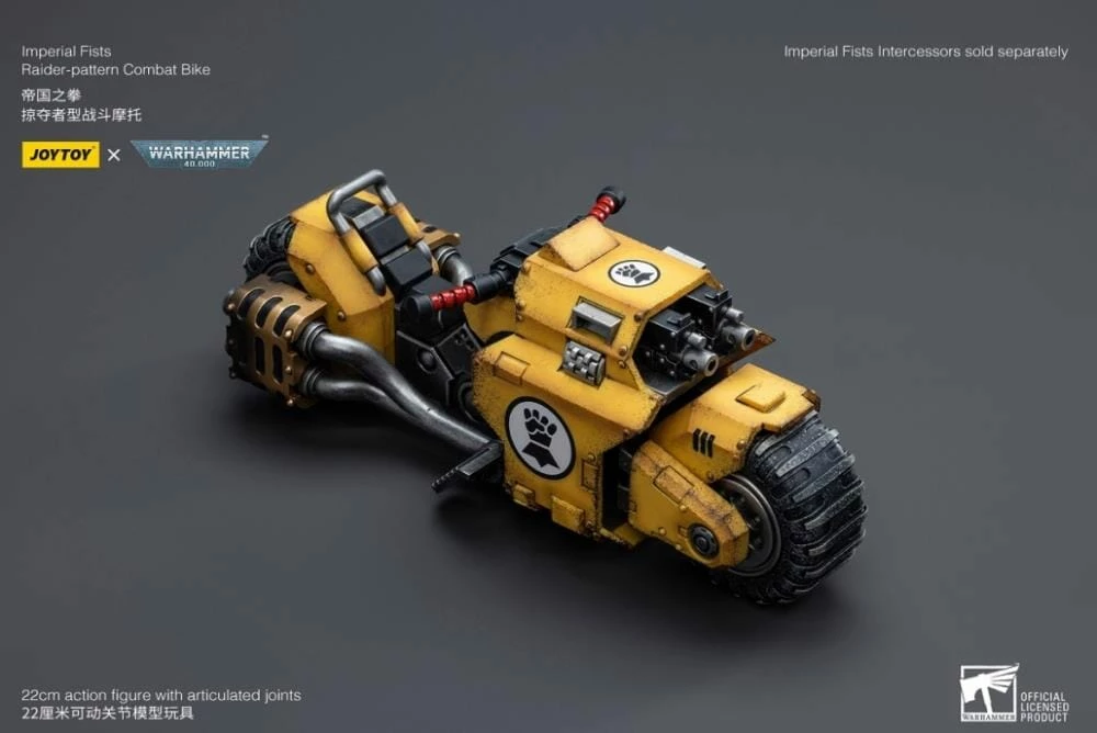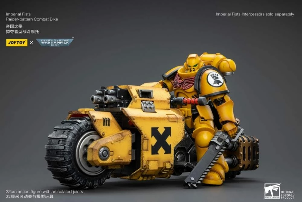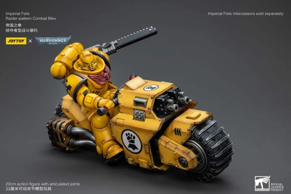 Joy Toy brings the Imperial Fists from Warhammer 40k to life with this new series of 1/18 scale figures. The Raider-Pattern Combat Bike is 8.66 inches with articulated joints and an impressive level of detail and coloring.